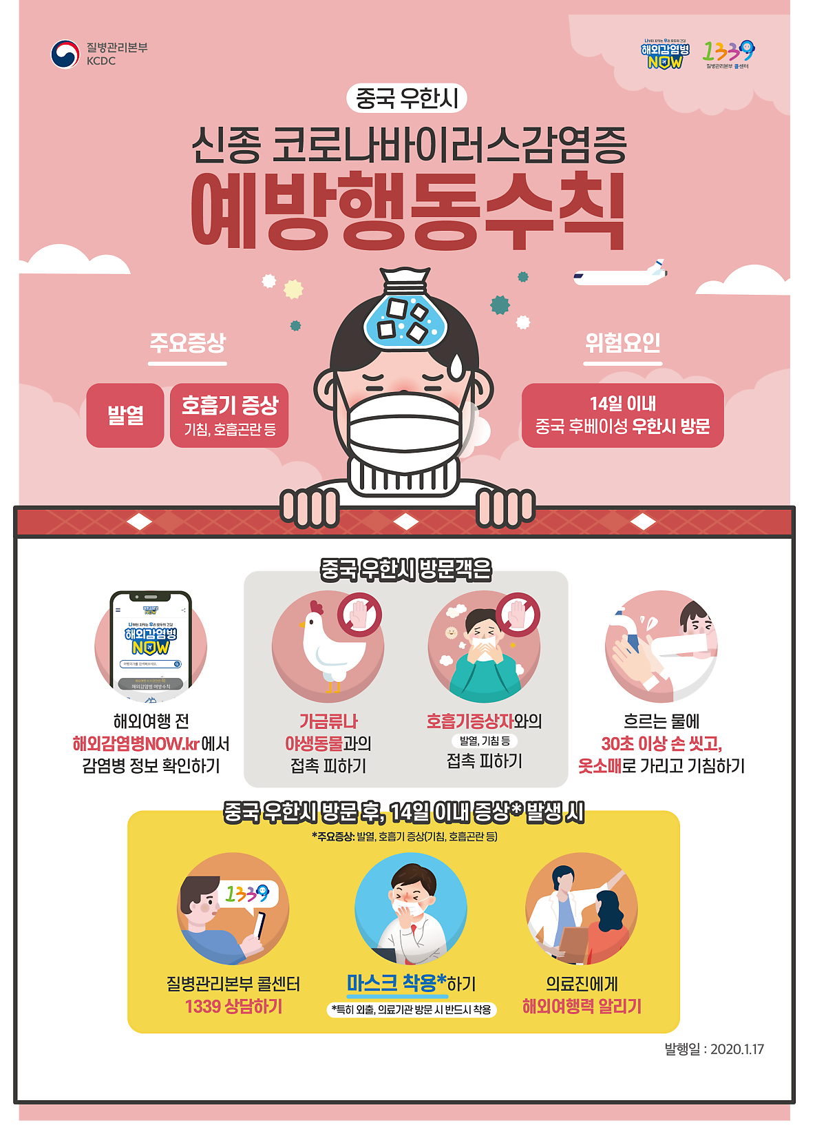 이에  중국 우한을 방문할 경우 현지 야생동물·가금류 접촉을 피하고 감염 위험이 있는 시장과 의료기관 방문, 발열·호흡곤란 등의 증상이 있는 사람과의 접촉을 피해야 한다. 질병관리본부에 따르면 귀국 뒤 14일 안에 관련 증상이 나타날 경우 질병관리본부 콜센터(1399)나 보건소 상담을 진행해야 한다. 또 흐르는 물에 30초 이상 손 씻기를 꼼꼼히 하고, 기침 등 호흡기 증상이 있을 경우에는 외출하거나 의료기관에 들를 때 마스크 착용 같은 예방 수칙을 지켜야 한다.