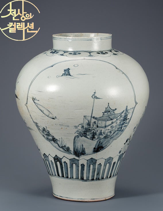 그런 박병래 컬렉션에서도 유독 눈에 띄는 보물! 바로 <백자청화 산수 무늬 항아리>입니다.