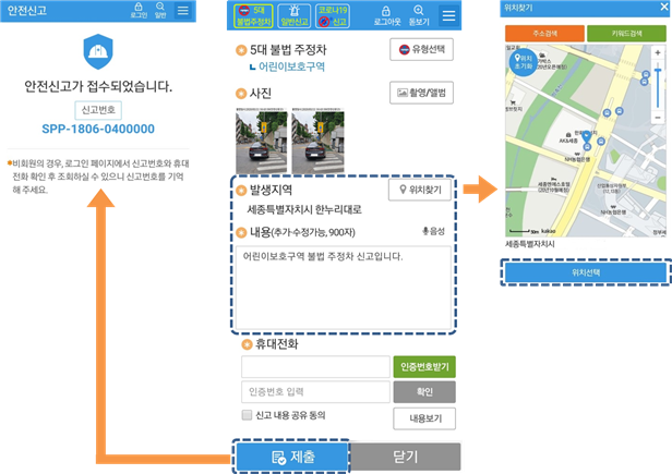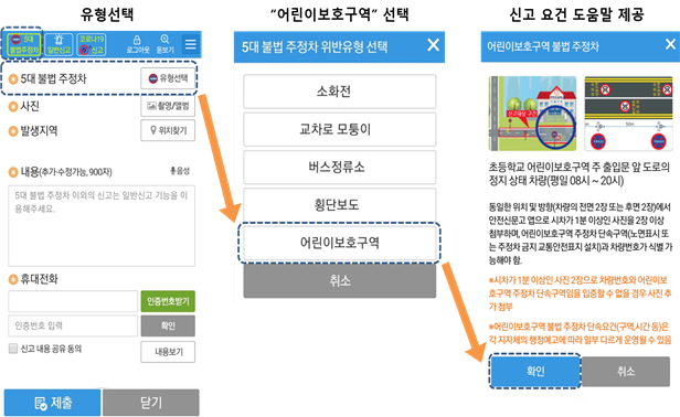 앱을 실행하고 첫 화면에서 4대 불법주정차 유형을 선택한 뒤, 금지구역에서 1분 이상 간격으로 촬영한 사진 2장을 첨부해 제출하면 된다.